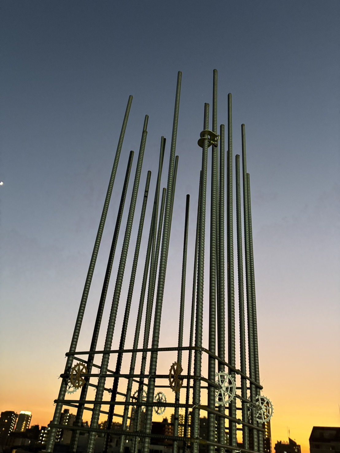 建物の柱部分では、縦方向に立ち上がる鉄筋を組み、構造の基礎となる形をつくっていきます。