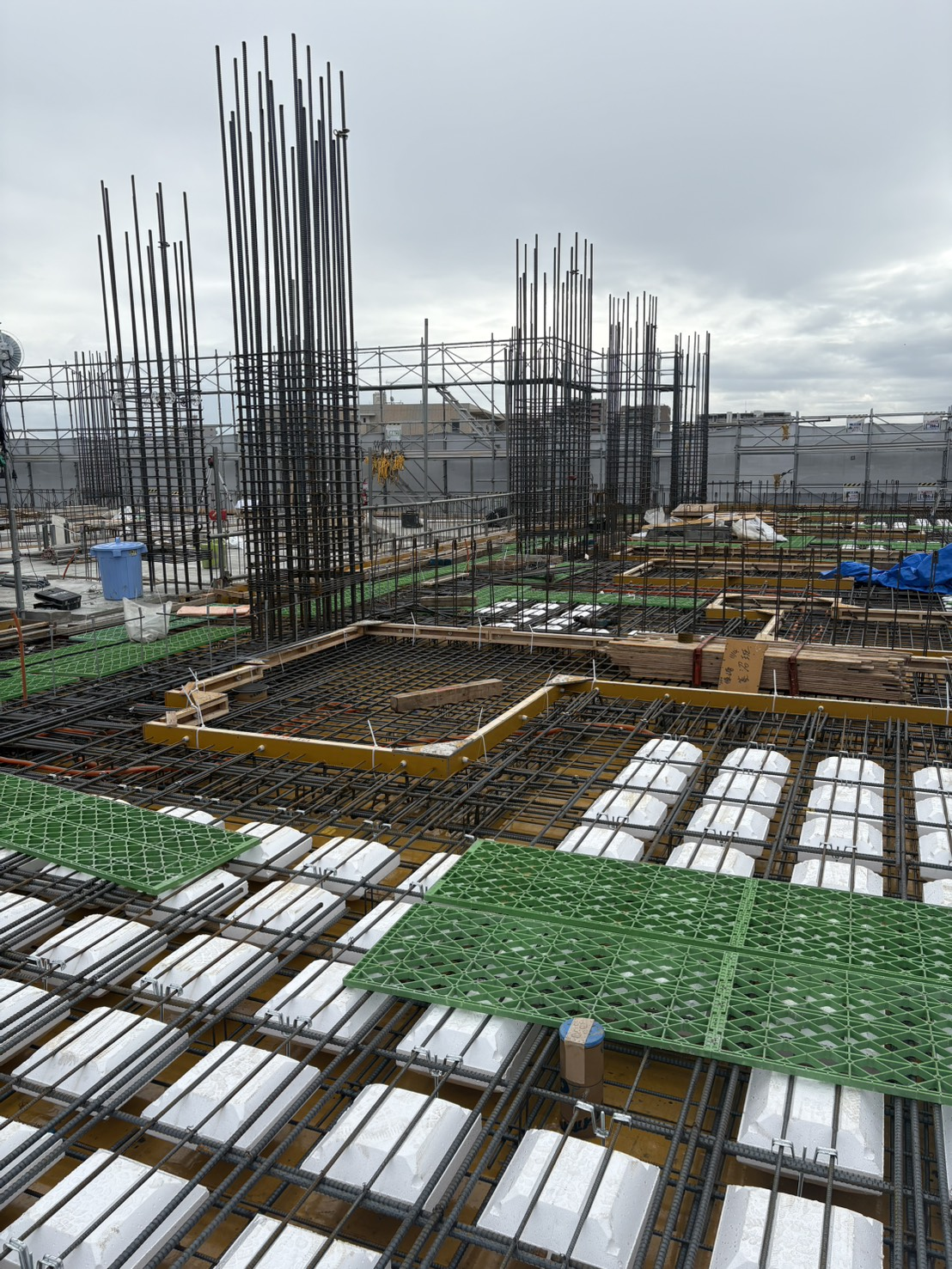建設現場では、柱や床など建物の構造部分となる鉄筋を組み上げていきます。