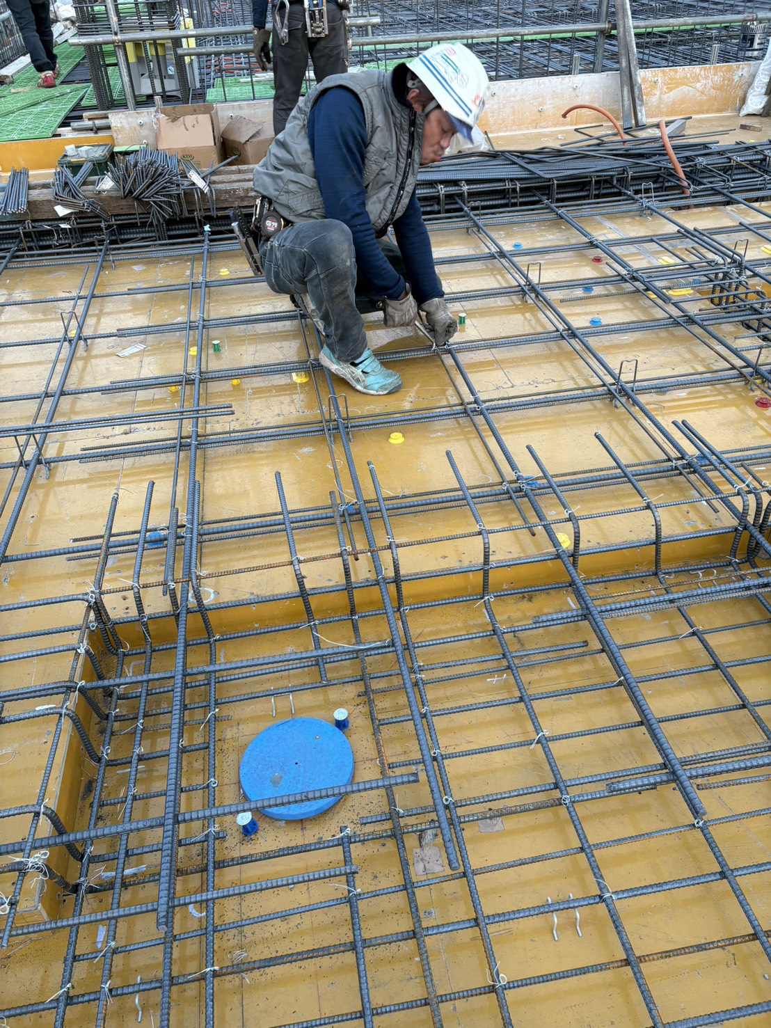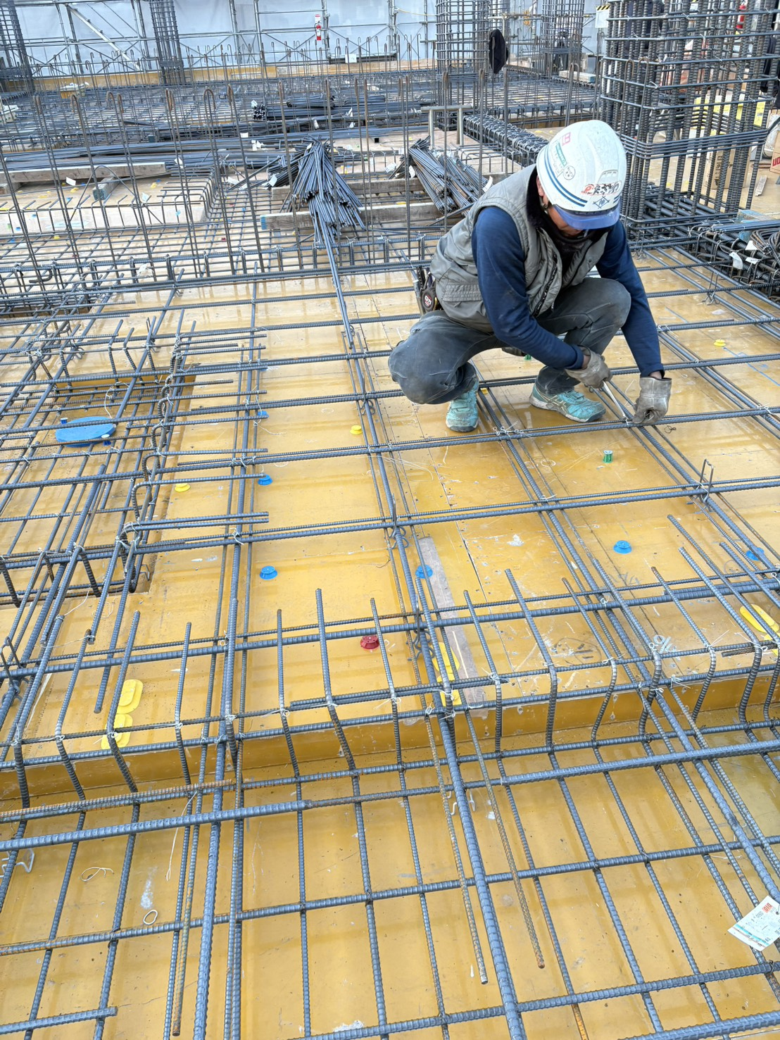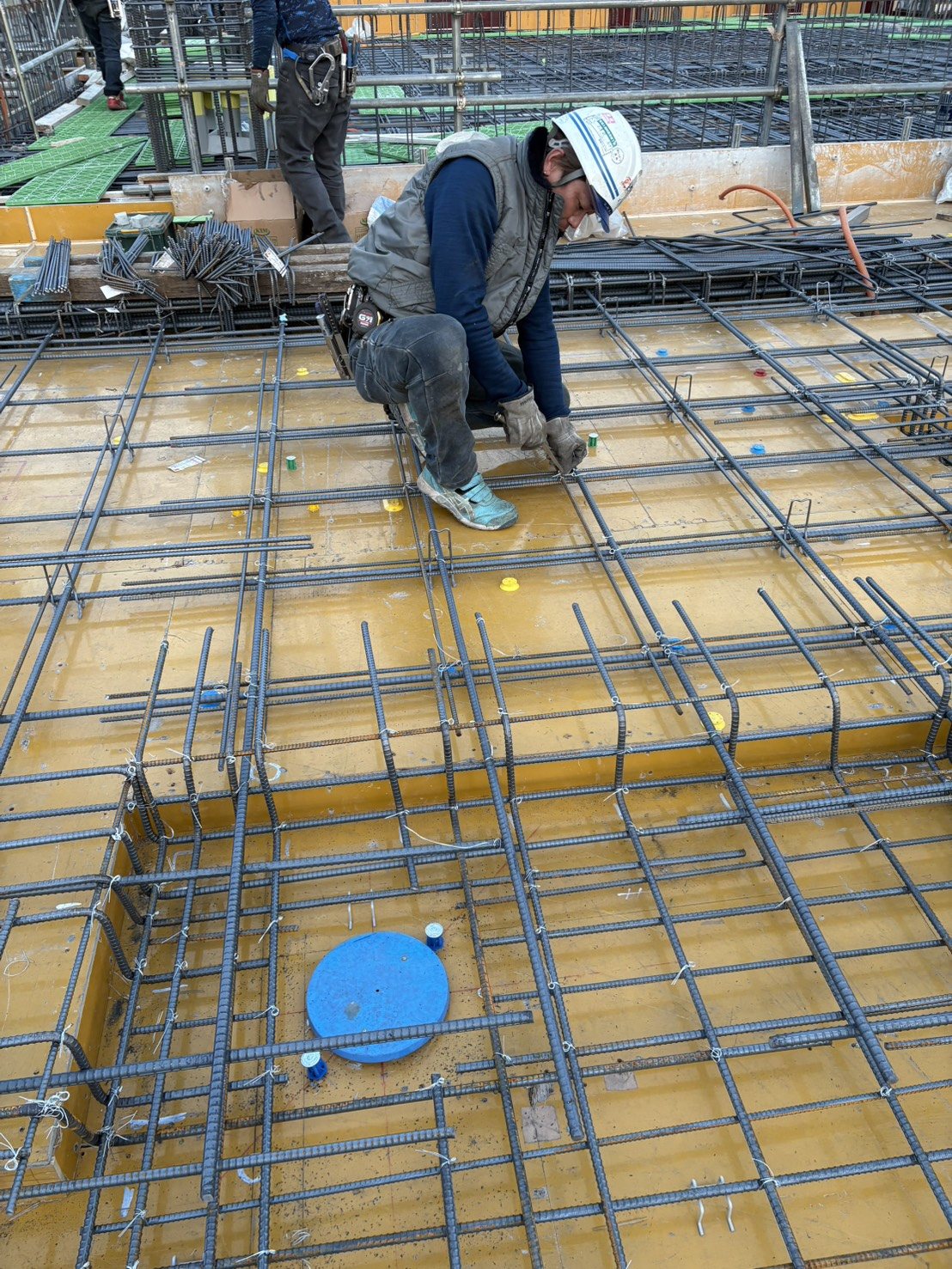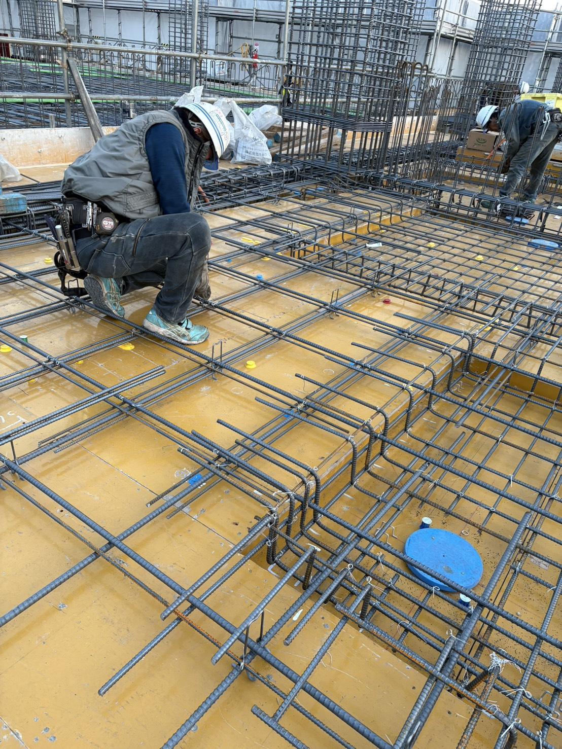 足場や周囲の安全を確認しつつ、工程に沿って配筋作業を行なっている様子です。