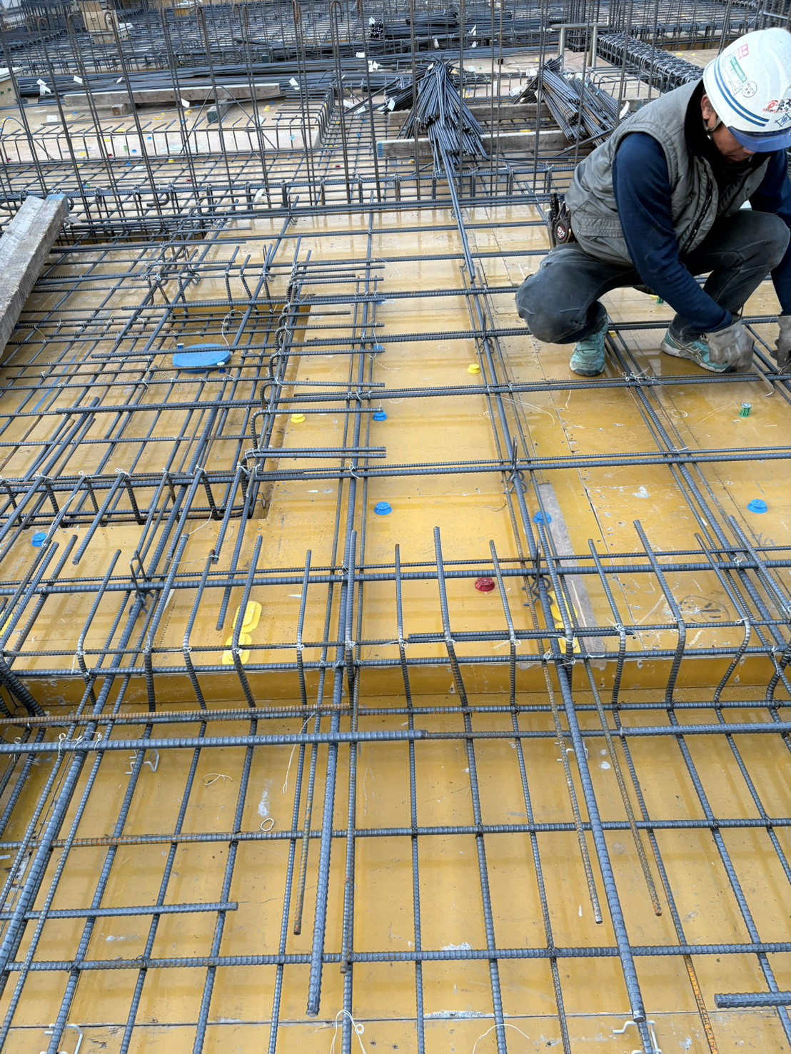 床部分の配筋では、広い範囲に鉄筋を配置し、建物全体を支える構造を形づくります。